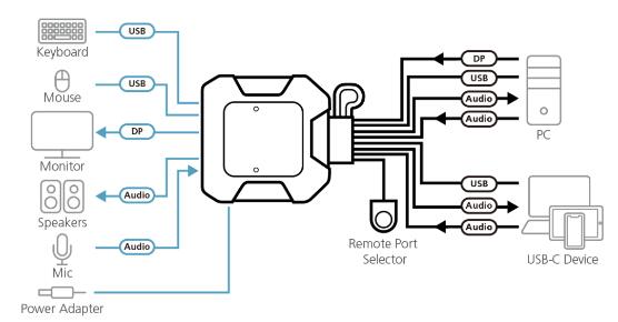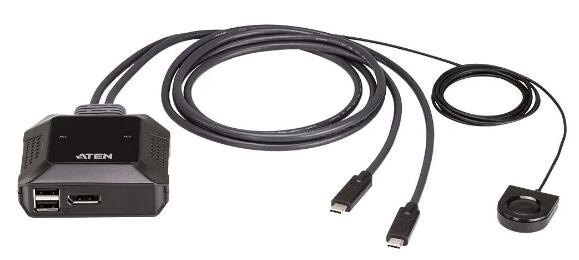ATEN CS52DP控制一台Displayport接口的计算机和一台USB-C设备,支持高达4K分辨率和立体声音频。