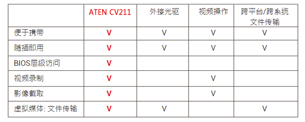 CV211最突出的特点就是使用简单,即插即用,无需安装软件即可进行BIOS层级访问。 一旦通过CV211将笔记本电脑连接到目标服务器,即可在几秒钟内进行诊断和操作。该设备还通过USB 2.0和VGA复合线缆提供双向文件传输、热键宏、视频录制和截图功能。CV211的兼容性可扩展到现代Windows操作系统,包括Server 2008 R2和2012,同时还支持Linux 2.6+和OS X 10.1+。