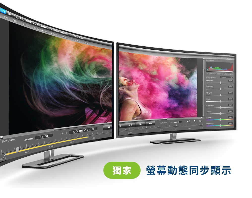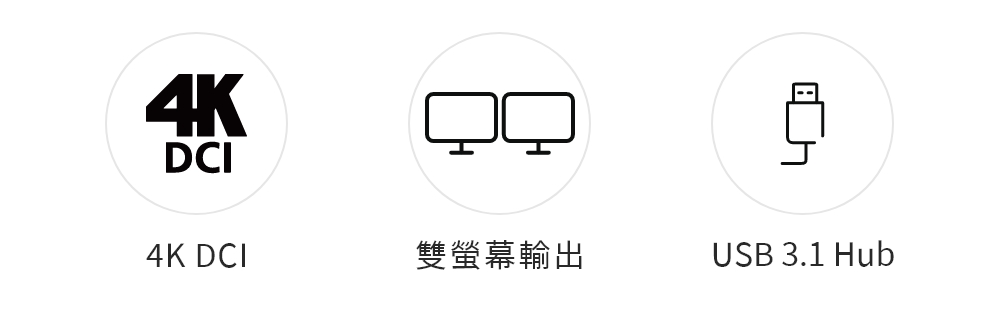 高画质视频分辨率 – 4096 x 2160 @ 60Hz、3840 x 2160 @ 60Hz;2埠USB 3.1 Gen 1集线器,支持SuperSpeed 5 Gbps数据传输速率