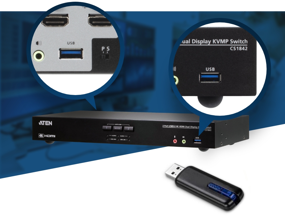 考虑数据实时共享的需求,CS1842 的正面与背面,各内建1个 USB 3.1 Gen 1 Type-A 端口,支持 5 Gbps 数据传输速率,可加速操作并更有效率地切换使用 USB 接口设备。