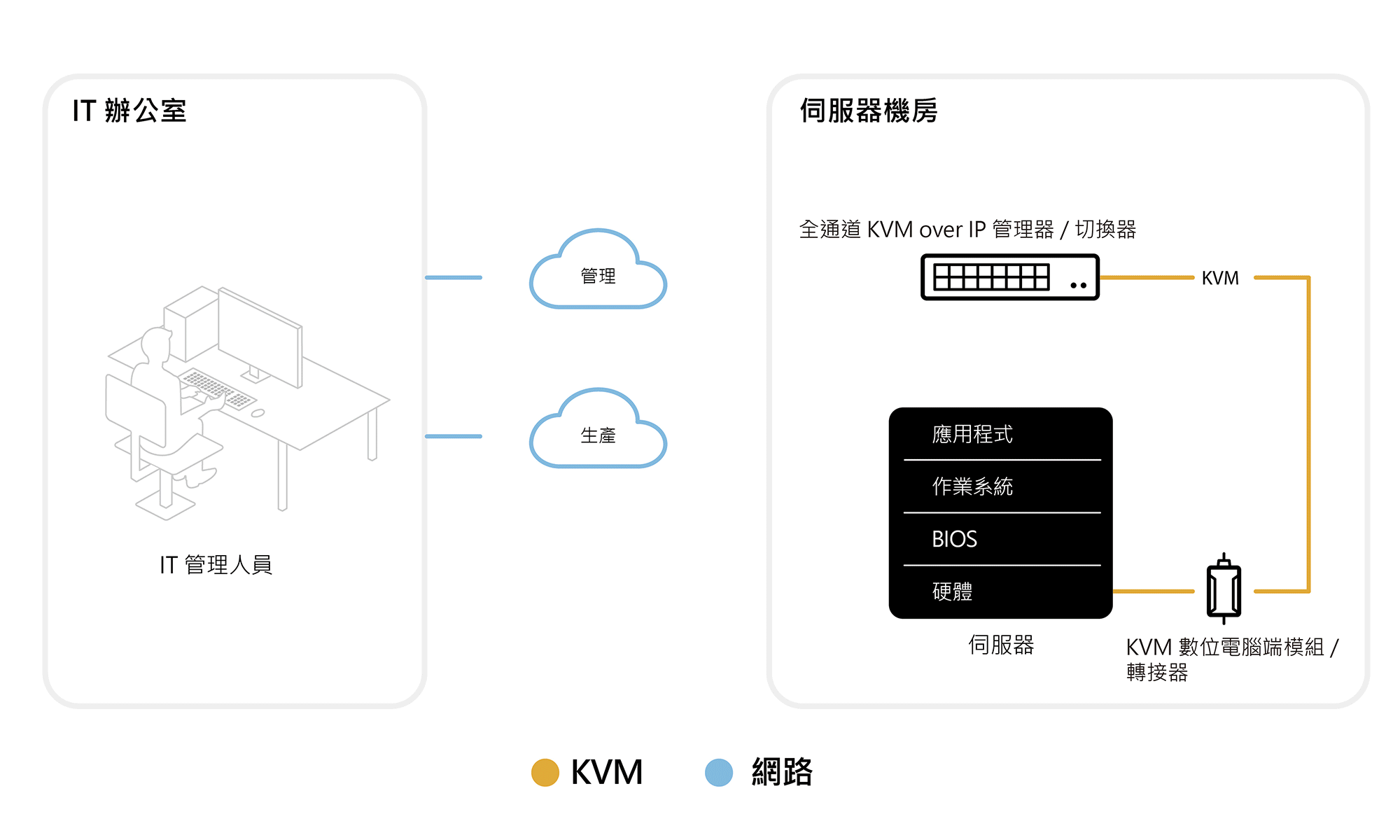 因为管理网络和生产网络各自独立运作,连接到管理网络的全通道 KVM over IP 管理器,让 IT 管理人员能在生产网络停摆期间,通过 BIOS 对服务器执行及时故障排除 (如网络修补程序、影像更新与重新启动等)和系统维护。此方法可作为紧急应变措施,同时确保端对端的数据与工作流程安全。