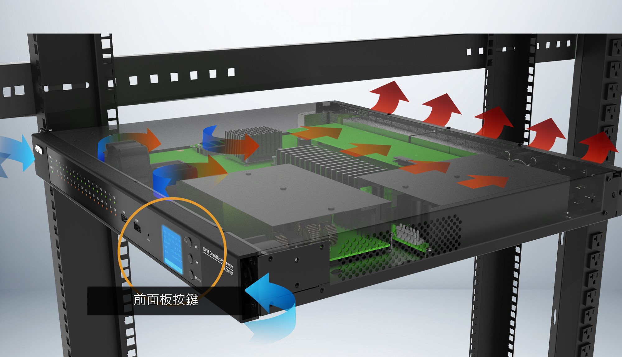 全通道 KVM over IP 管理器,内建 4 个服务器级的智能风扇模块,加速周围空气流动效率,强化系统可靠性。当系统闲置或工作量不大时,风扇就会以低于 40 分贝的低频运转。此外,前置面板的按键可用来执行及时的故障排除,在意外状况发生时执行迅速的设备配置与系统重启,同时锁定以隔绝未经授权的访问,保护系统设置的安全。