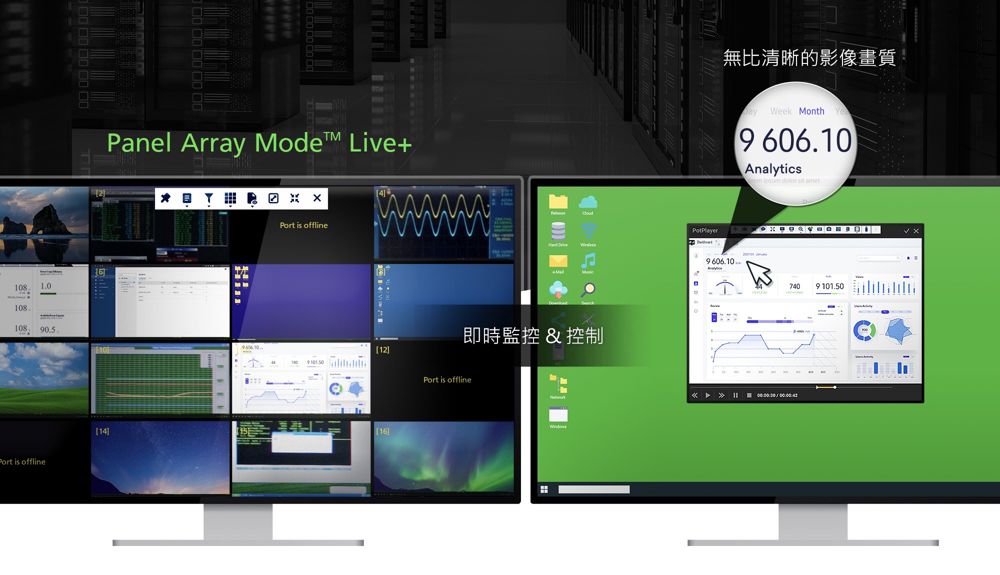 有了 Panel Array ModeTM Live+,实时监控就会变得轻松无比。以 24-bit 真色彩、1920 x 1200 @60Hz 画质显示控制窗口,且所有服务器的影像可以多画面切割显示,画面数量可依照需求变化(KG0016 高达 4x4、KG0032 可达 4x8)。控制及矩阵排列窗口的影像来源,皆是极度流畅的进行直播串流,提供优化的情境感知。