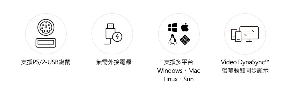 视频动态同步显示(Video DynaSync™)技术–ATEN独家技术能避免开机会产生的显示器显示问题,并在切换连接端口时保持最佳显示器显示分辨率