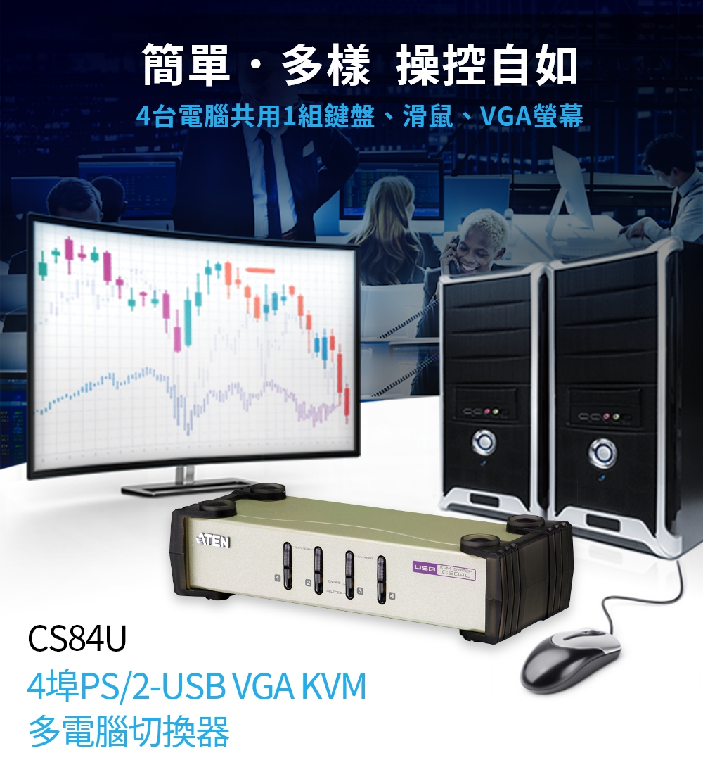 工作时,须要同时操控多台电脑,但又不想看到桌面乱七八糟!使用 ATEN CS84U 多电脑切换器,只要通过1组 VGA 屏幕、USB 或 PS/2 键盘与鼠标,即可同时操控4台电脑。桌面干净清爽、工作更有效率。