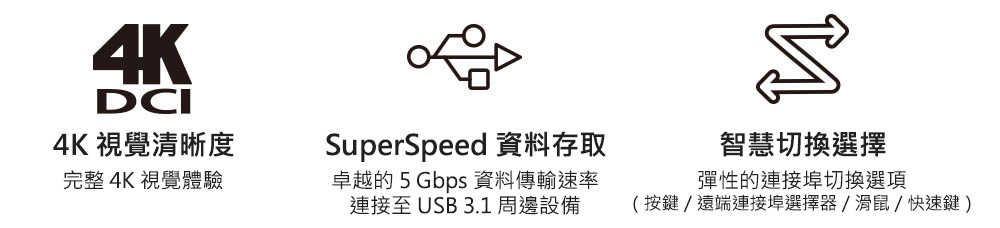 集成以上卓越功能,并支持USB 3.1 Gen 1数据传输速率、USB供电设计,以及热键、鼠标和外接式切换按键等便利的端口切换方式,CS1953让用户随时掌握桌上多媒体的新趋势,并更有效率地工作。
