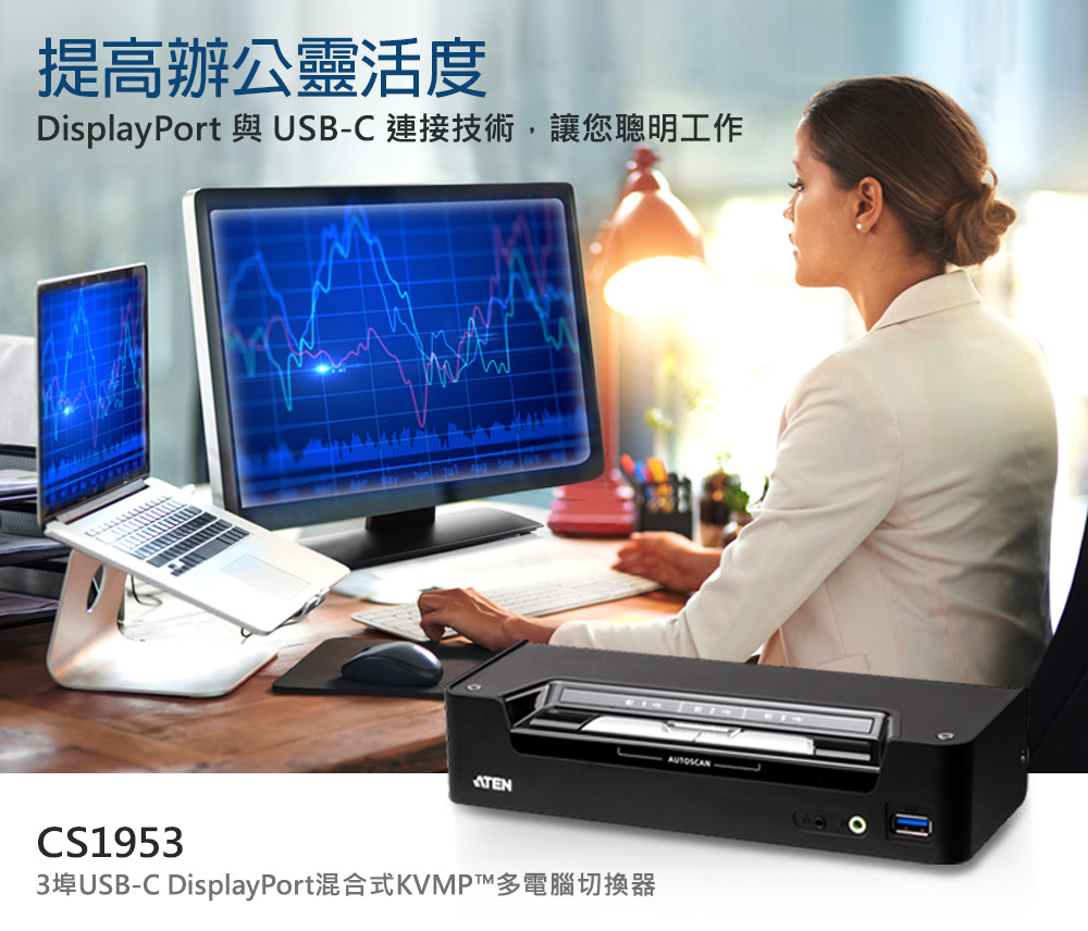 ATEN CS1953是一款混合式KVMP™多电脑切换器,将USB-C装置和DisplayPort电脑结合为一组桌上工作站。功能比传统数字接口多电脑切换器更进阶,CS1953的USB Type-C接口不仅可以传输视频、音频、数据,甚至支持USB Power Delivery 3.0为USB-C装置供电。这代表只需使用一条USB-C线材,使用者可以简化繁复的线材配置,体验更好的工作环境。