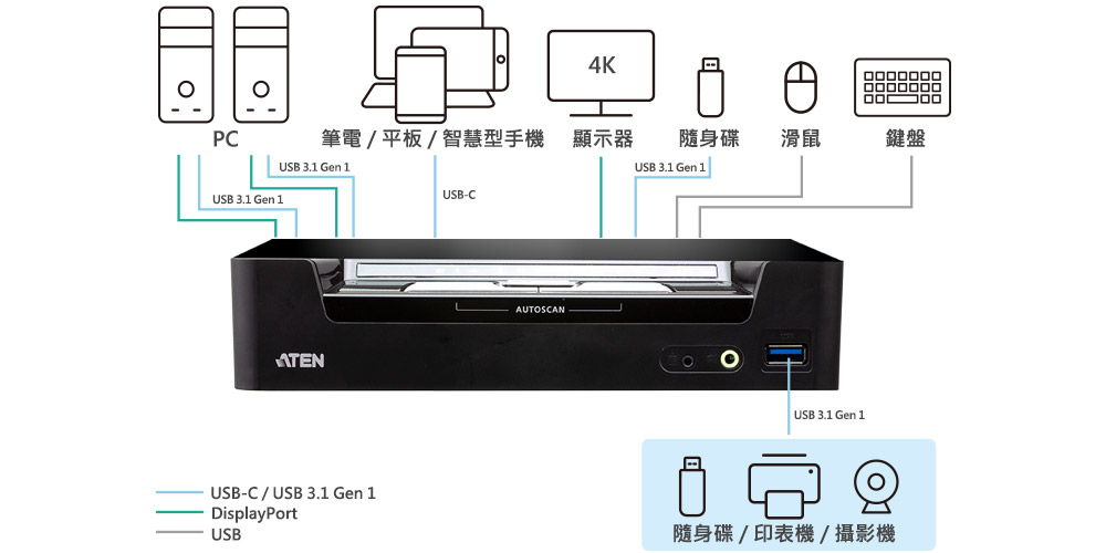 通过1组USB键盘、鼠标和DisplayPort接口屏幕控制2台DisplayPort接口电脑和1台USB-C装置,并分享使用2个USB接口设备
