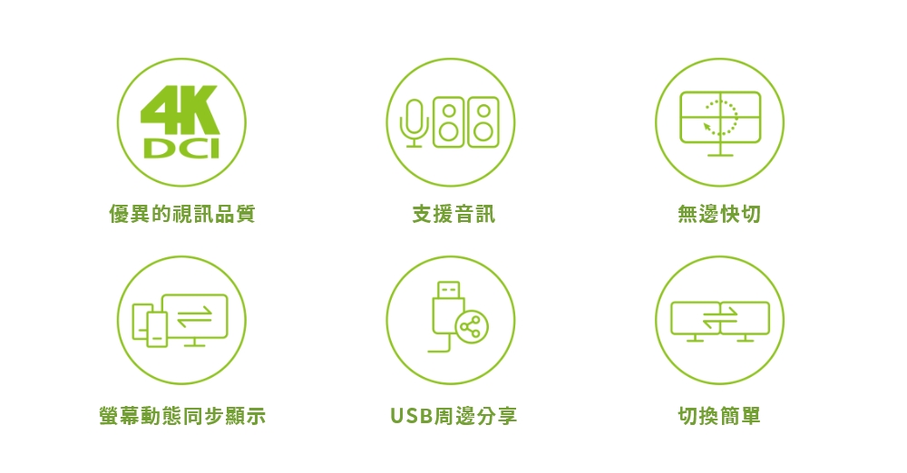 支持双屏幕输出,同时监看多个重要信息亦可提高操作效率。在第1个屏幕以全屏幕、4分割画面、PiP、PbP 及 PoP 子母画面模式,显示多个电脑设备的画面,并且可将其中1个电脑画面,在第2台屏幕以全屏幕模式观看。