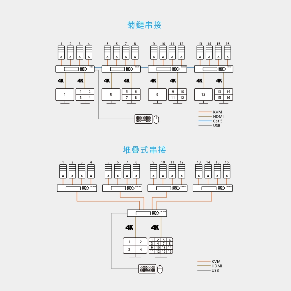 具备弹性扩充的功能,可以使用菊链方式额外串接3台CM1284,从单一控制端一次管理最多16台电脑设备,亦可以在1台 CM1284占口级联4台CM1284,以4×4多窗口显示管理 16 台电脑设备。