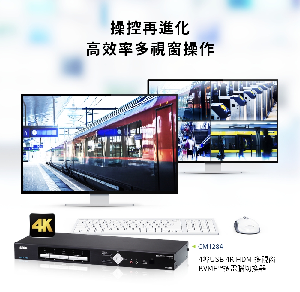 CM1284支持4K (4096 x 2160 @ 30 Hz)视频分辨率,在其控制端提供双屏幕输出,并且支持影像实时更新服务,其中一台屏幕画面具备多窗口模式功能,多窗口画面模式包含四分割画面模式、PiP (Picture in Picture) 模式、PbP (Picture by Picture) 模式和PoP (Picture on Picture) 模式,另一台屏幕则为全屏幕画面显示模式。不仅如此,CM1284支持ATEN独特的无边快切(Boundless Switching)专利技术,用户只须将鼠标光标移至或超过分割画面中单一窗口显示画面的分割窗口界线,即可直接快速地将键盘及鼠标的控制切换至该窗口显示的设备上,帮助使用者能直观、快速地选择切换想要控制的目标设备。