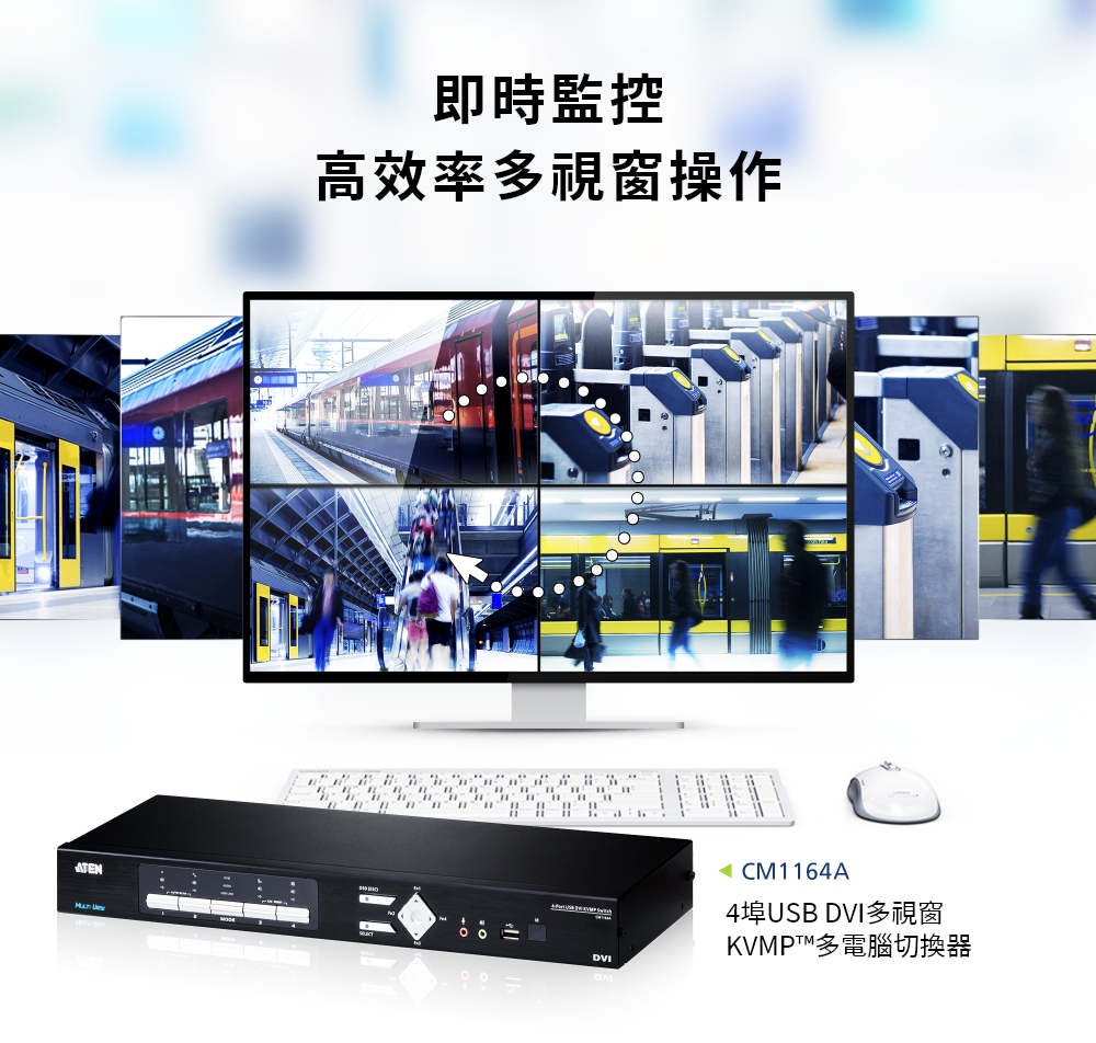 使用 CM1164A,可通过DVI 屏幕及1组 USB 键盘、鼠标,以多窗口显示观看并操控4台电脑。在多窗口显示模式下,也能以1920 x 1200高画质分辨率监控多个画面。内建 USB 2.0 集线器,可在4台电脑共享2组 USB 接口设备,当其中一台电脑正在使用 USB 装置时,亦可将键盘、鼠标切换至另一台电脑设备操控。
