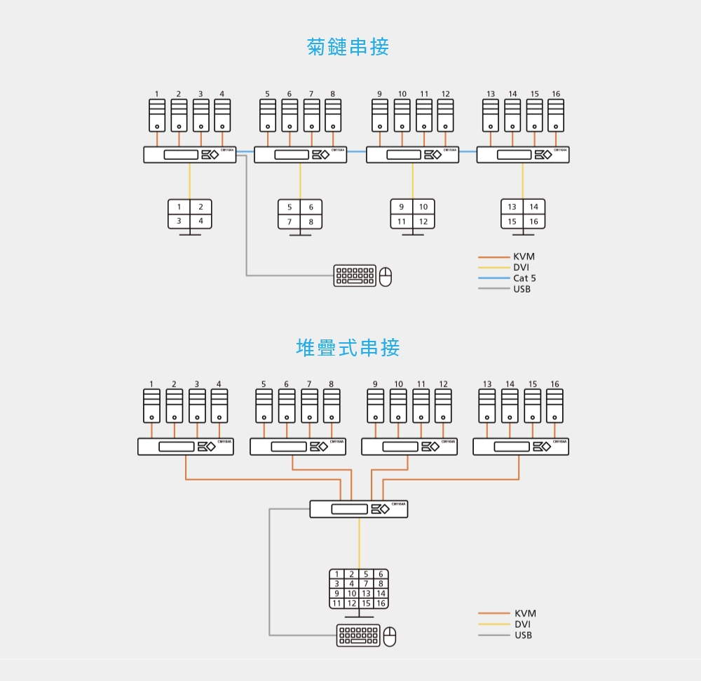 具备弹性扩充的功能,可以使用菊链方式额外串接3台CM1164A,从单一控制端一次管理最多16台电脑设备,亦可以在1台 CM1164A占口级联4台CM1164A,以4×4多窗口显示管理 16 台电脑设备。