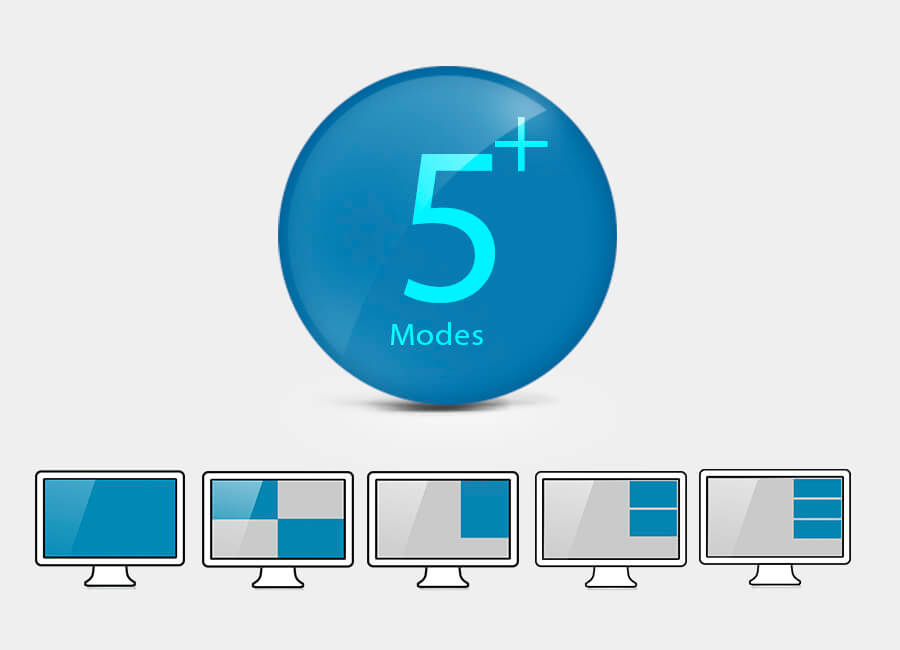 单一屏幕支持多窗口画面显示,可管理控制高达4个影像来源,并且支持四分割画面模式、PiP (Picture in Picture) 模式、PbP (Picture by Picture) 模式、PoP (Picture on Picture) 模式