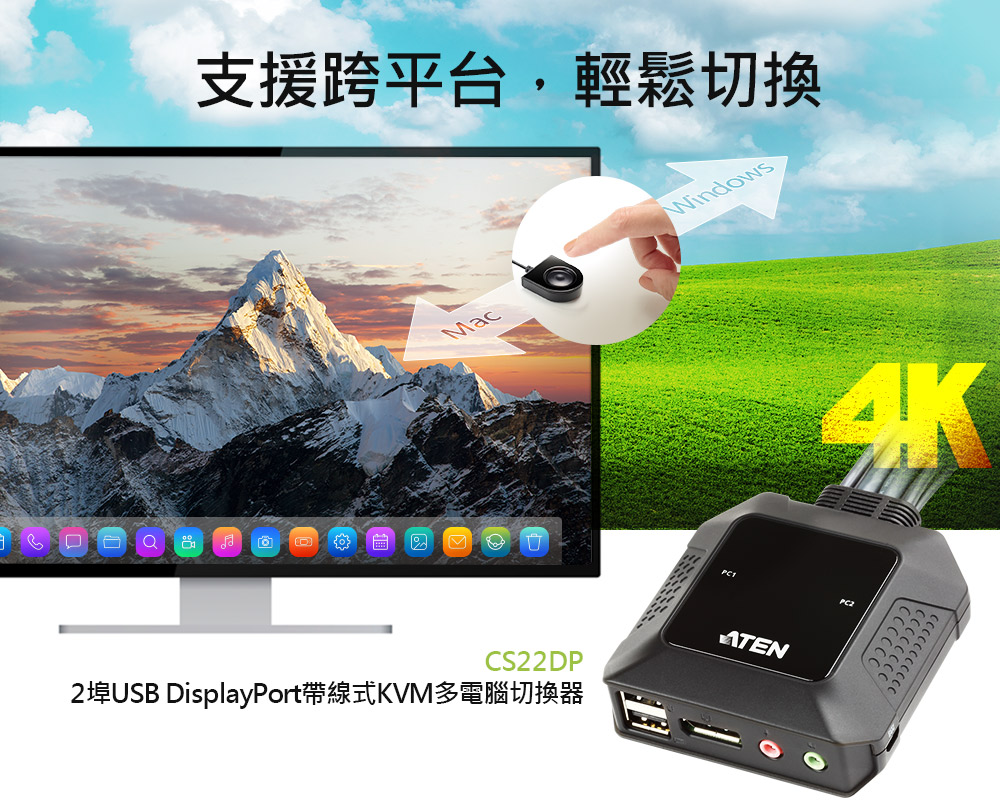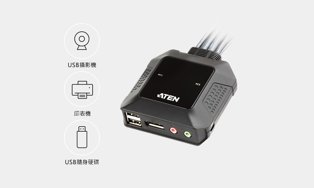 ATEN CS22DP 是一款2 端口USB DisplayPort 带线式KVM 多电脑切换器。让用户可通过一组USB 键盘、鼠标和DisplayPort 接口的屏幕开关两台电脑及其音频功能。让您通过 ATEN CS22DP 的外接式切换按键轻松快速地选择想要操作的电脑。